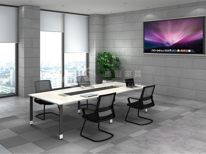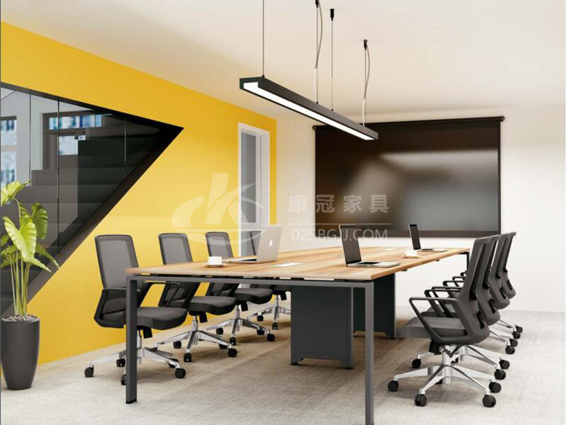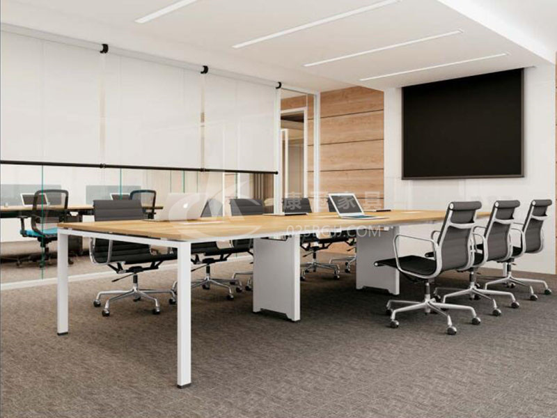 彩运网 板式会议桌采用与主管桌相同的设计元素,呈现办公空间整体性;模块式桌面咨询平台,独设的电路检修门,满足现代会议设备需求。