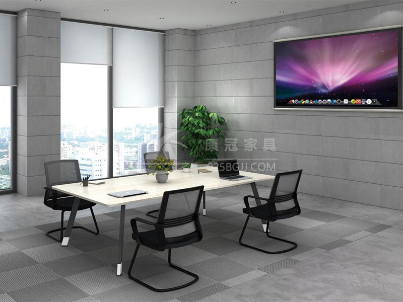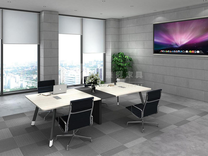 彩运网 板式会议桌采用与主管桌相同的设计元素,呈现办公空间整体性;模块式桌面咨询平台,独设的电路检修门,满足现代会议设备需求。