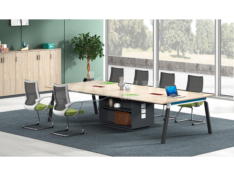 彩运网 板式会议桌采用与主管桌相同的设计元素,呈现办公空间整体性;模块式桌面咨询平台,独设的电路检修门,满足现代会议设备需求。