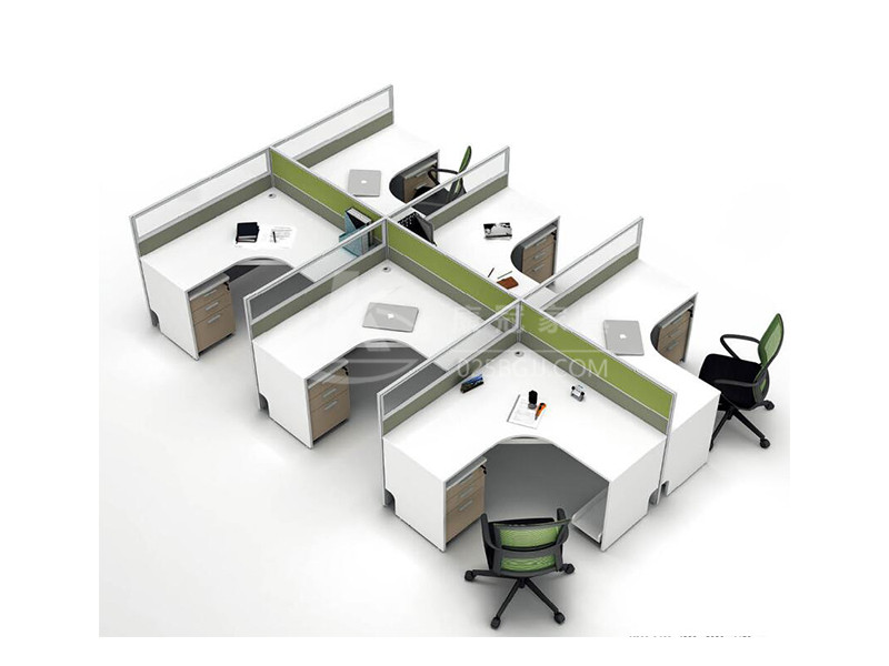 彩运网 屏风办公桌有十字型四人职员位的台面来用L型台面结合固定柜的配置,固定柜辅台延续移们收纳功能,中间使用6mm厚铝合金划分工作区城,屏风可以采用多种材质;