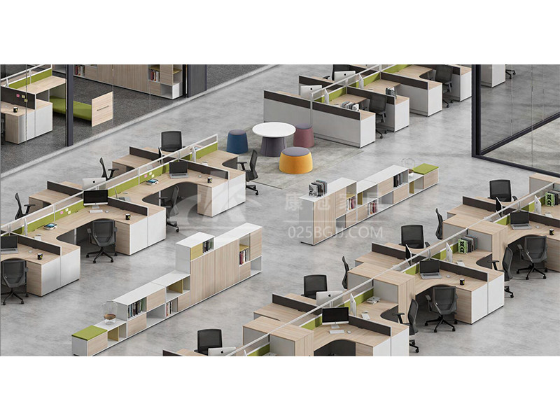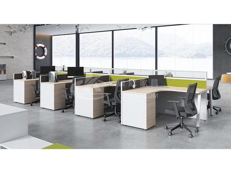 彩运网 屏风办公桌组合的方式是以小型办公团队为主,设置了L形台面的主管位,位四人职员位、小型治谈的会议空同,保证了团队的整体性,适合需要及时沟通、交流、互动公的形态;